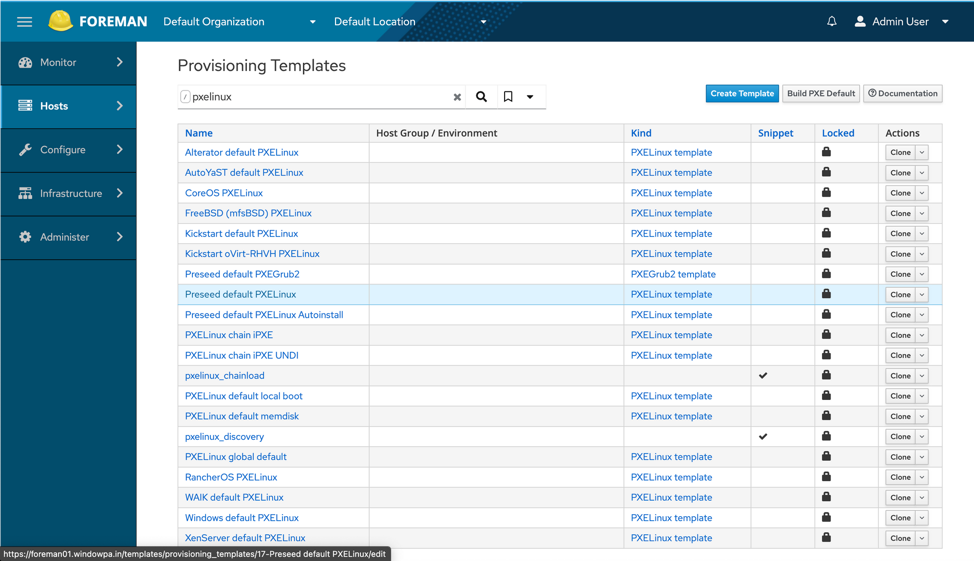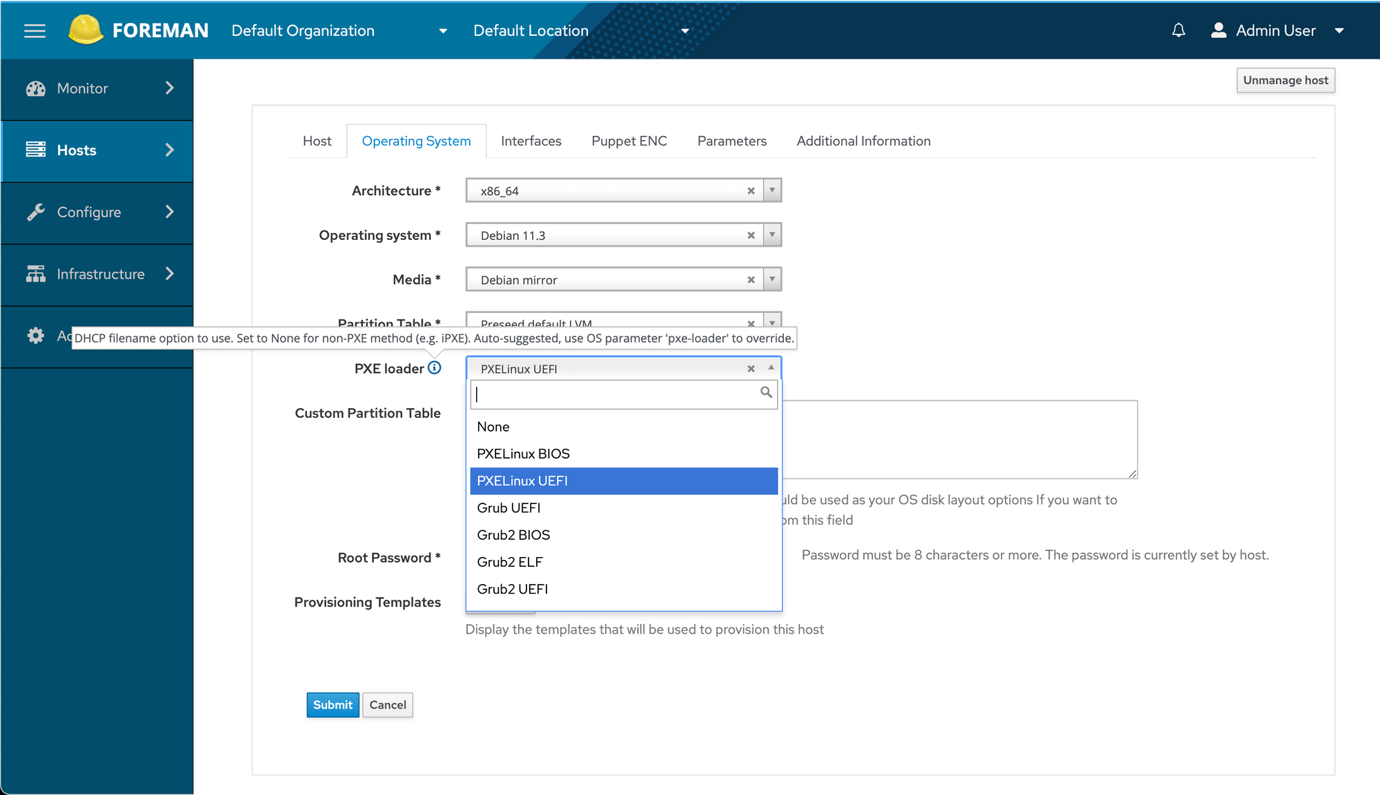 Preseed default PXELinux from the dropdown.We navigate back to our newly defined host, and select PXELinux BIOS as the PXE loader for it.