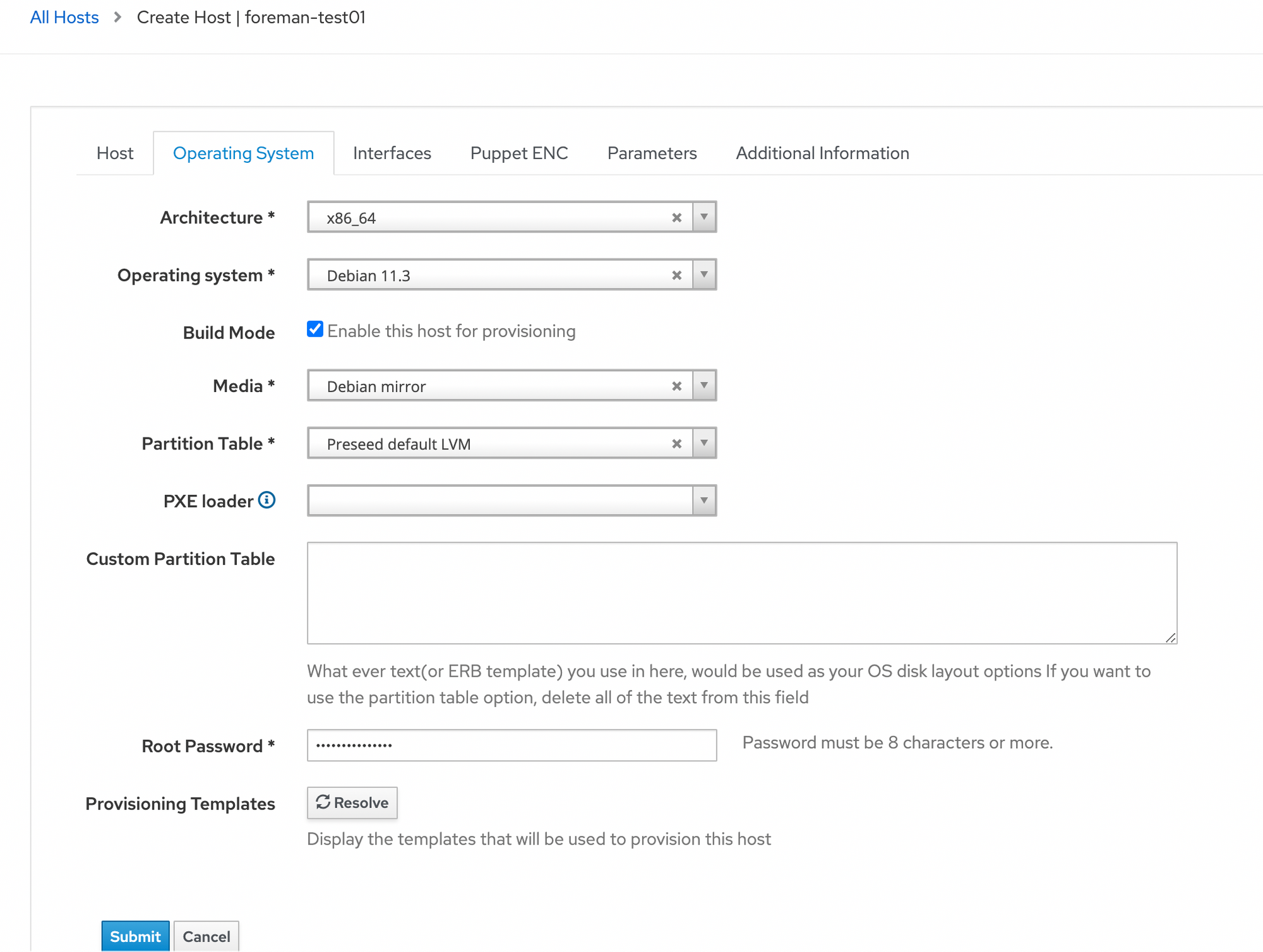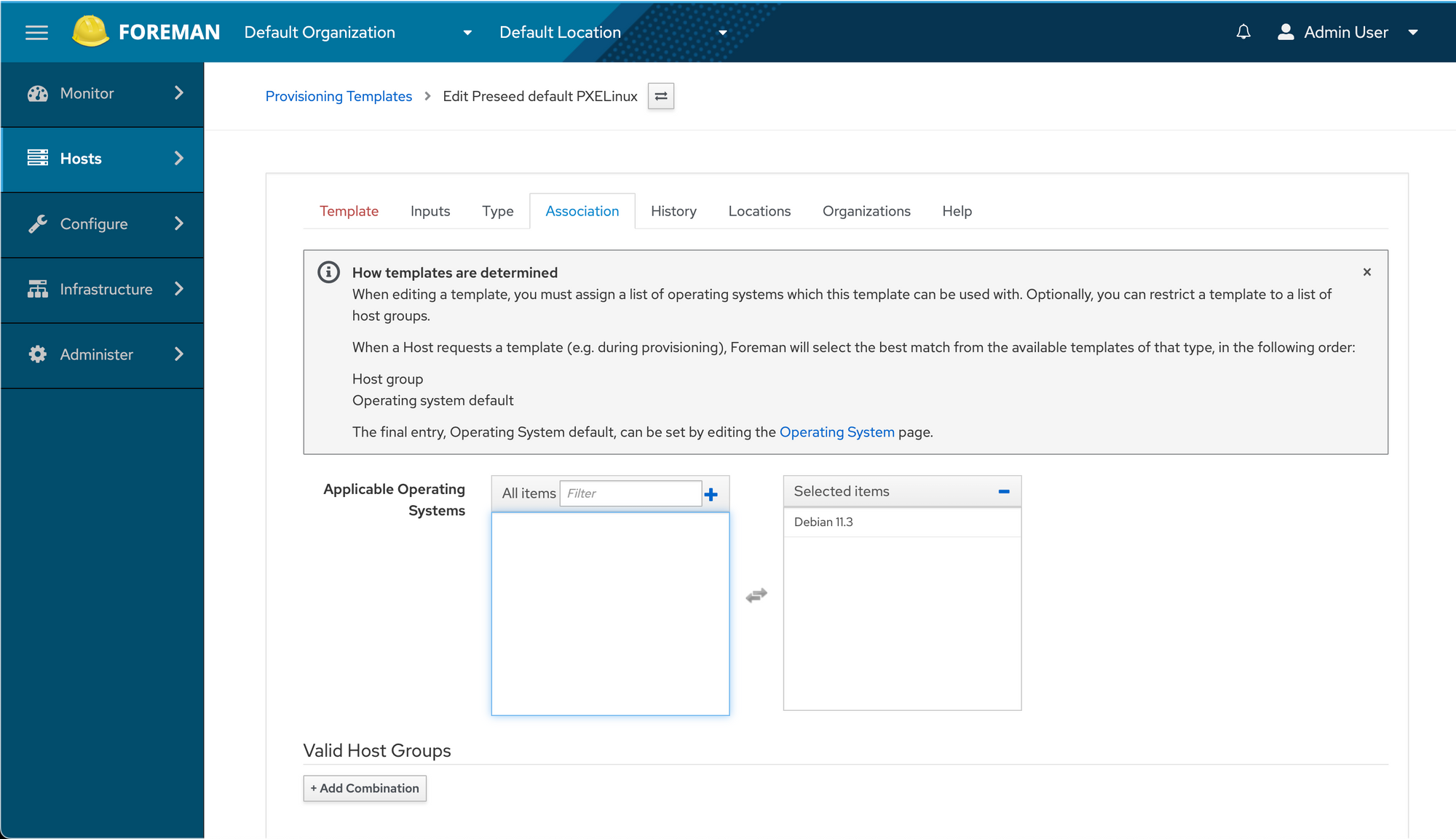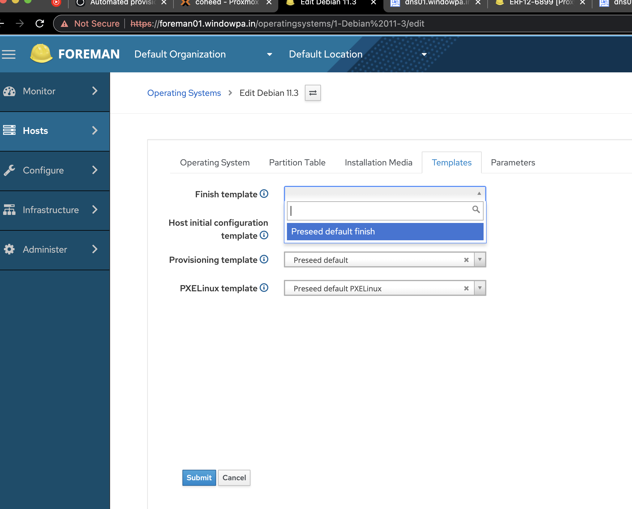 Once again, a new dropdown appears in our Operating Systems -> Debian 11.3 -> Templates tab... and we select the new Provisioning template.