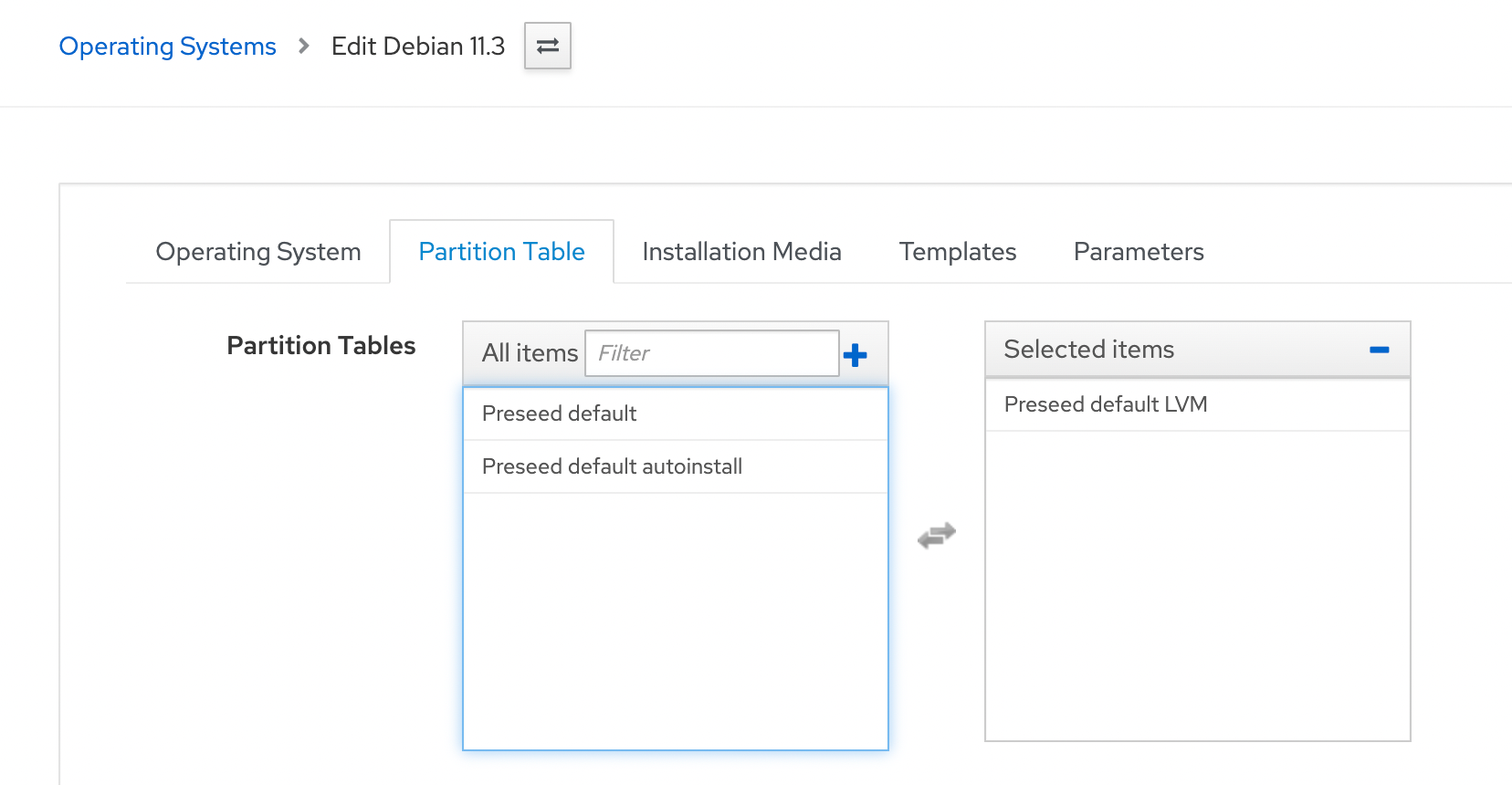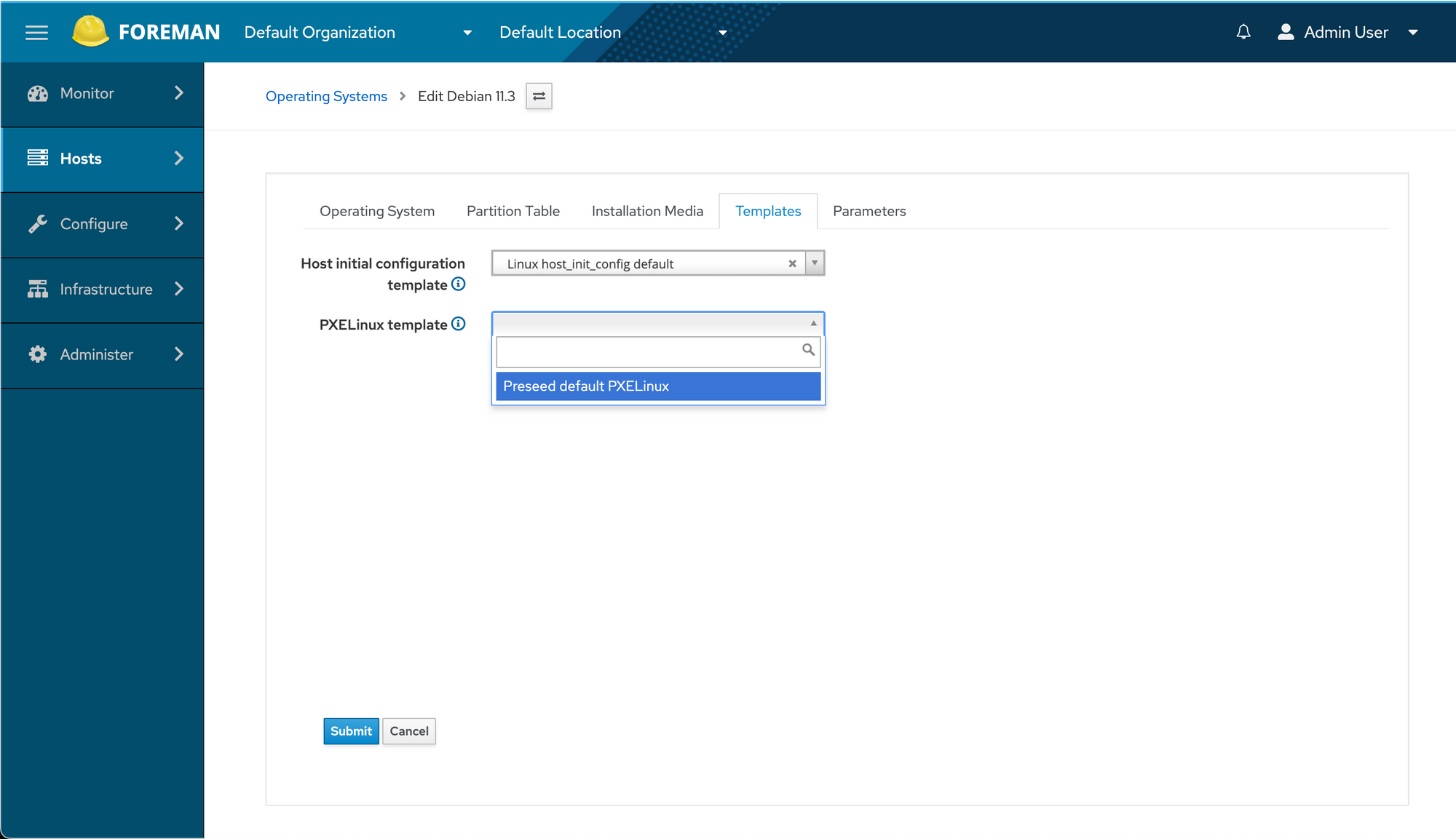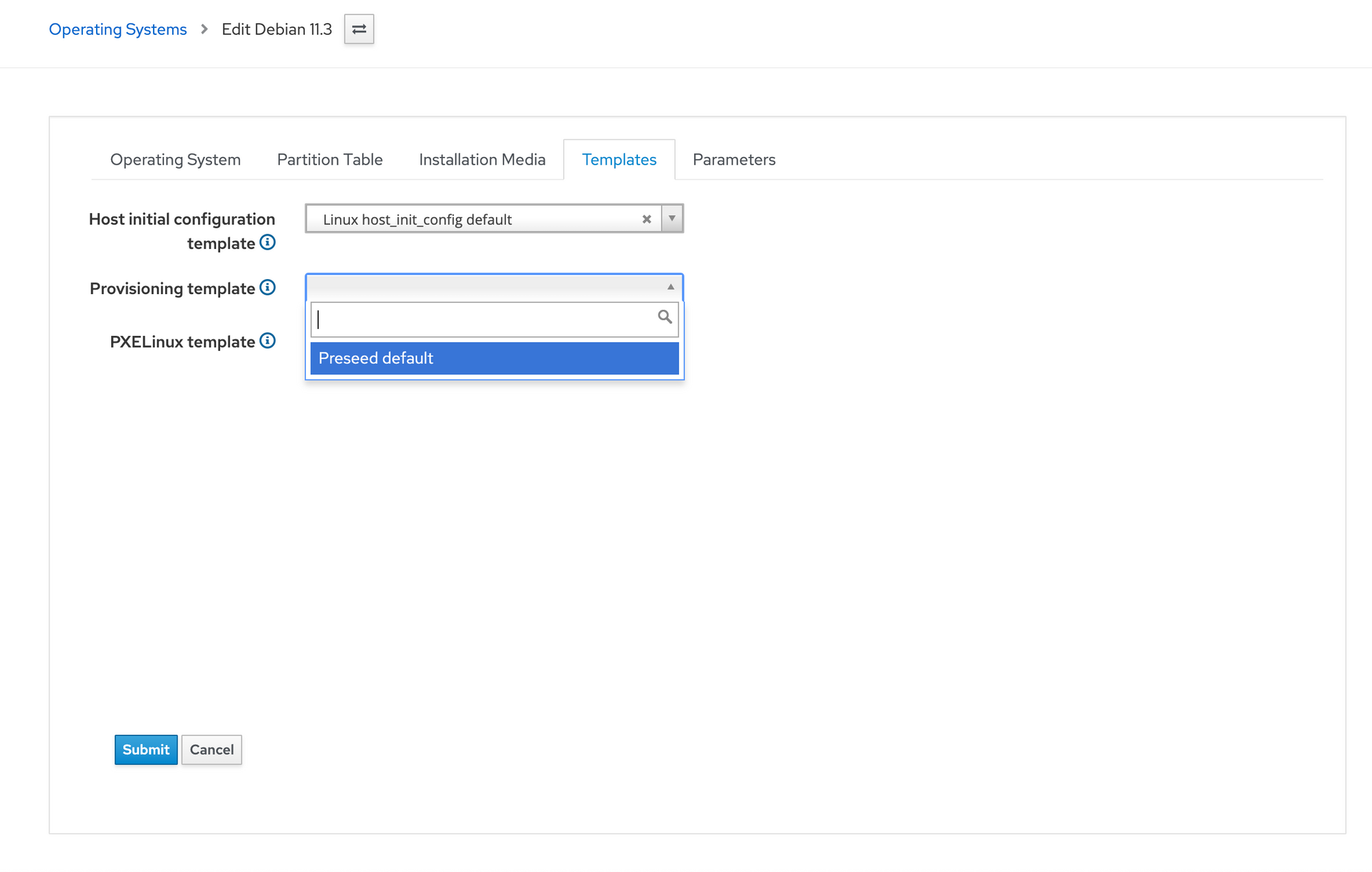Navigating back to the Operating System definition for Debian 11.3, we open the Templates tab, then select the Preseed default PXELinux template in the new PXELinux template dropdown, and Submit.