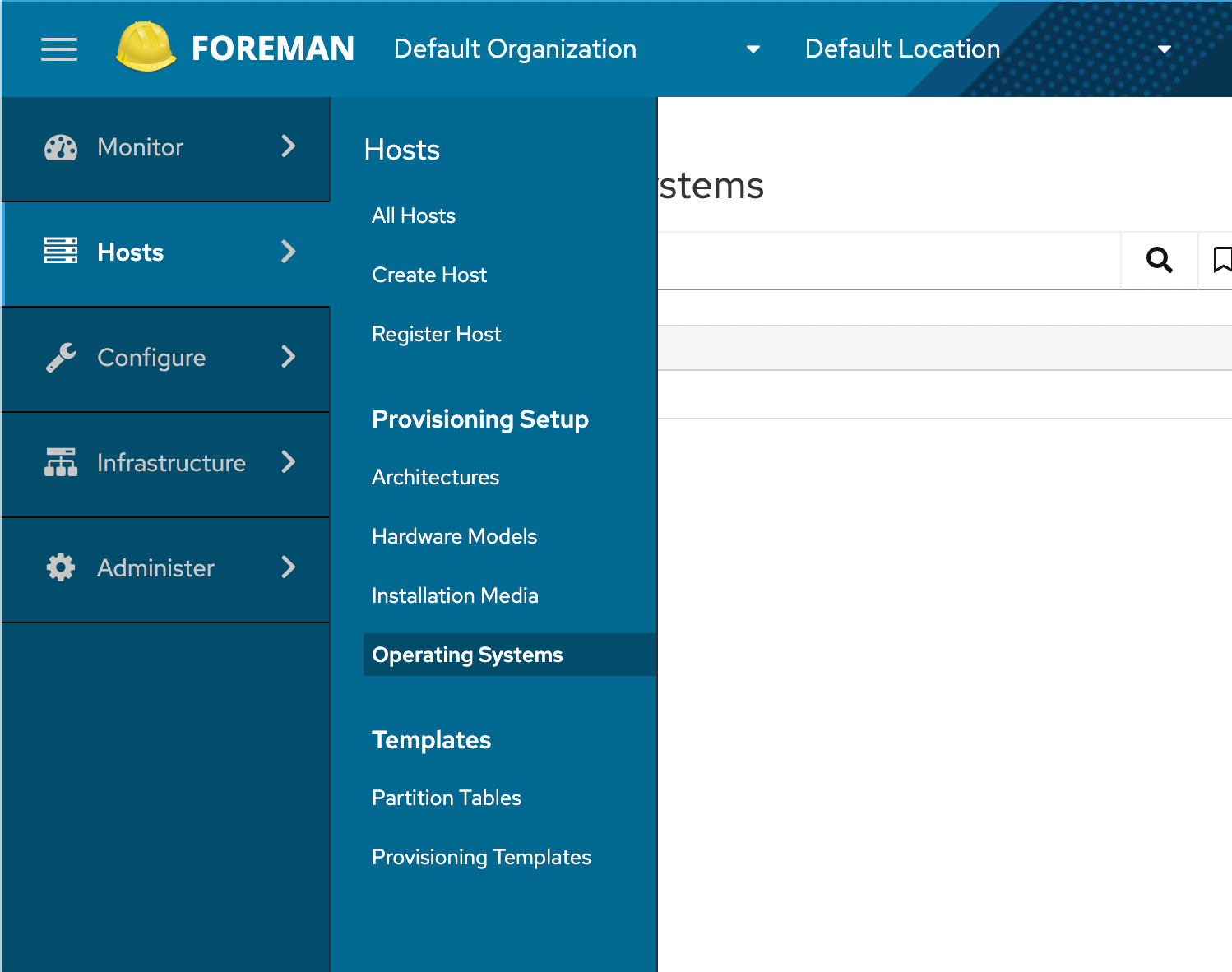 Navigate to Hosts -> Provisioning Setup -> Operating Systems.