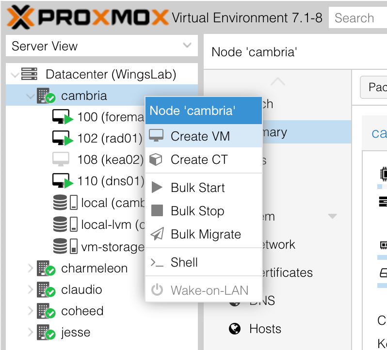 We need to create a machine in Proxmox and grab its MAC address to add to Foreman. We open Proxmox, right click a host we want to deploy on, then click Create VM.
