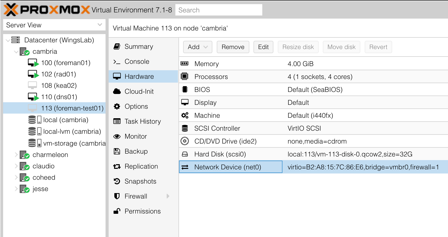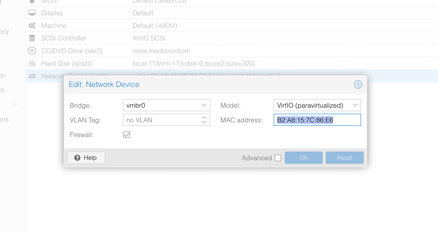Now that the VM has been created, we go to its Hardware tab and open the settings for its network card.