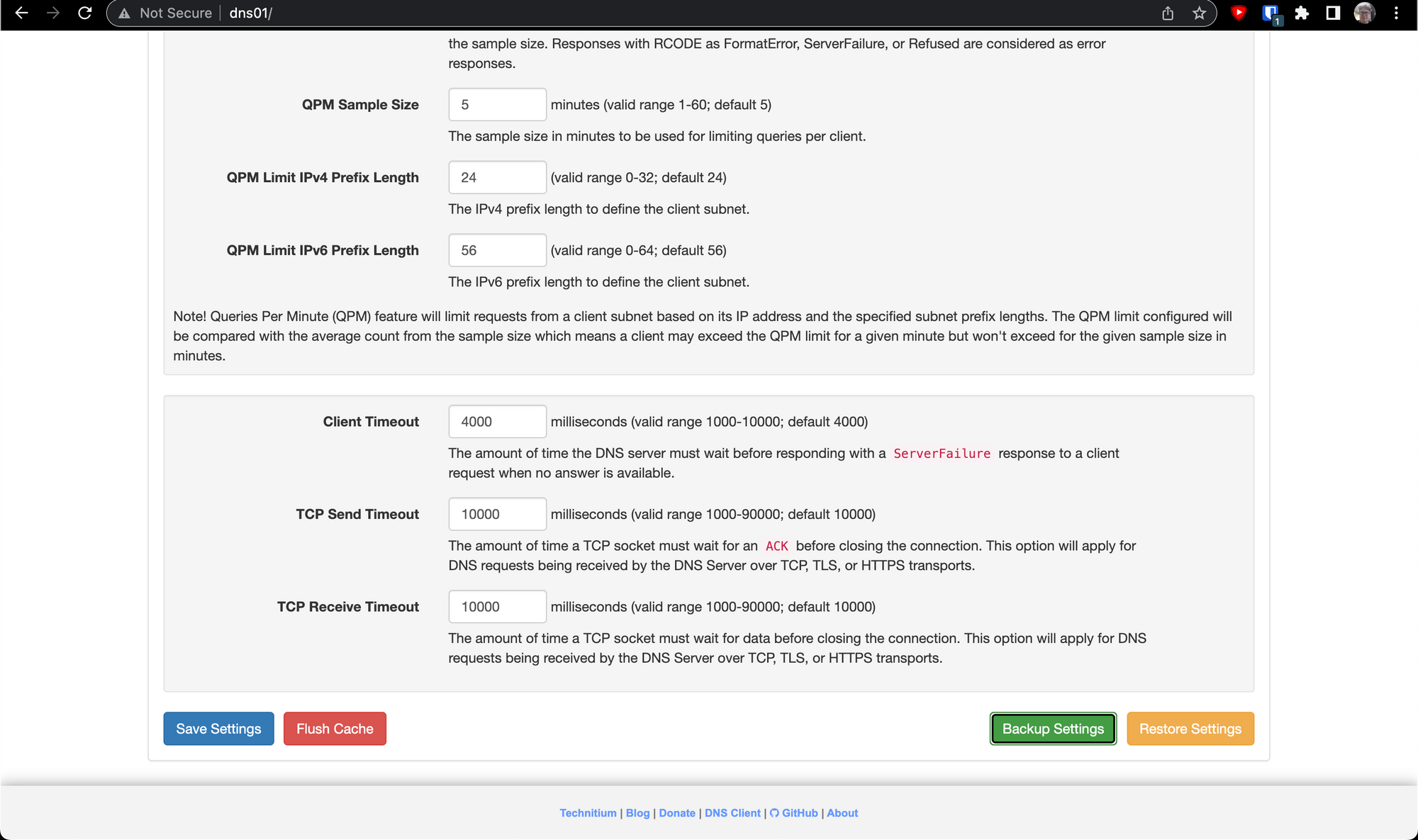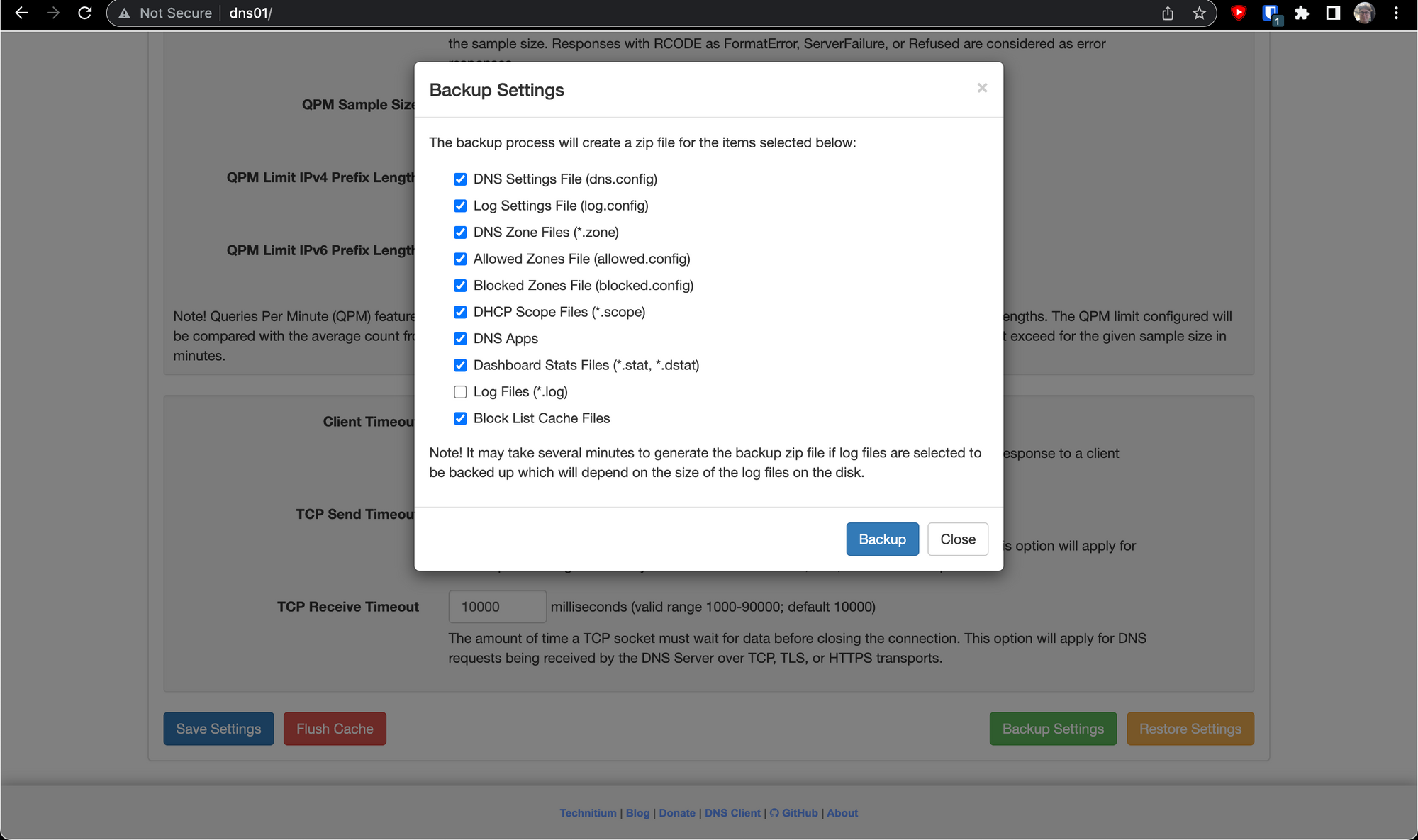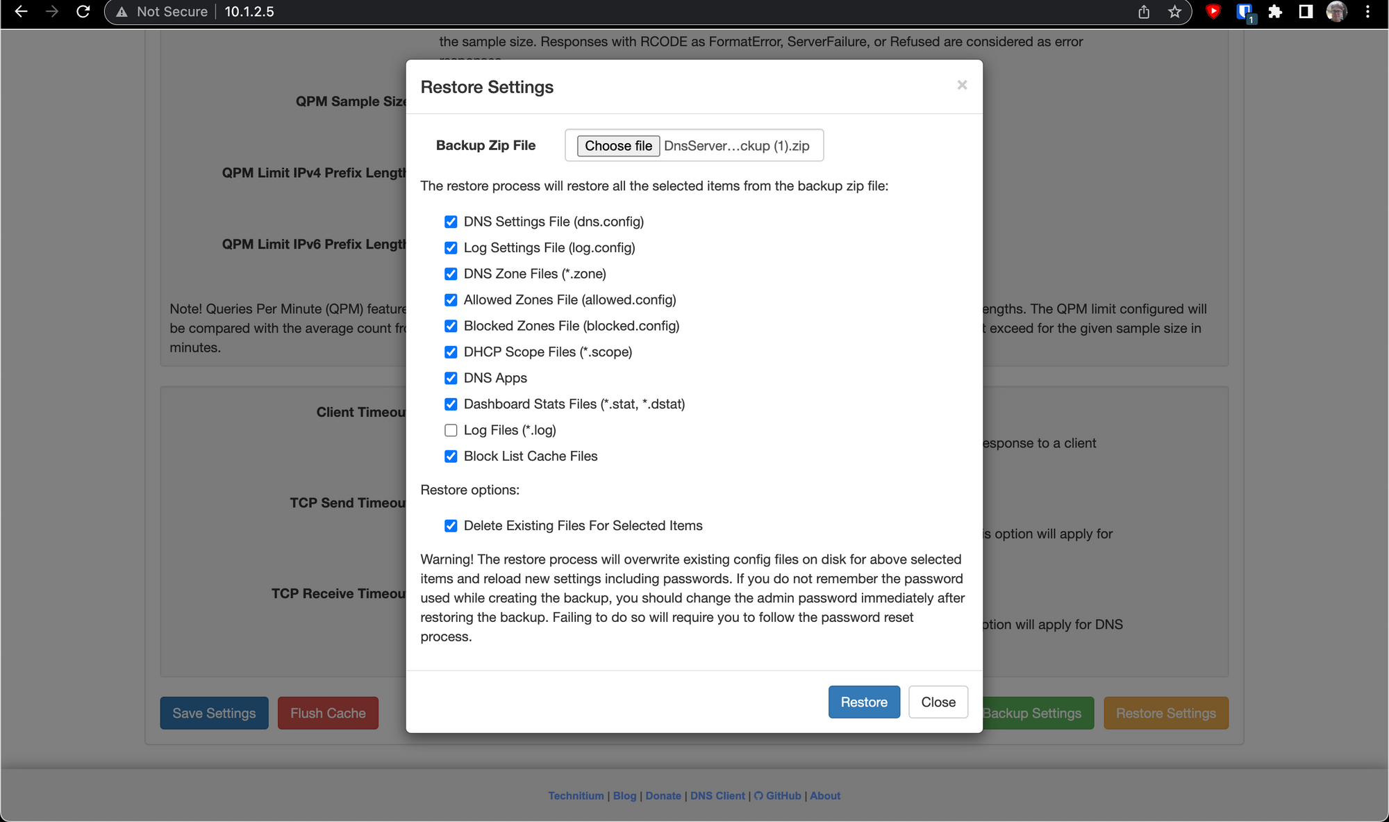 Restoring was just as easy. Logged into dns03, went to the same section and selected Restore Settings instead, and...