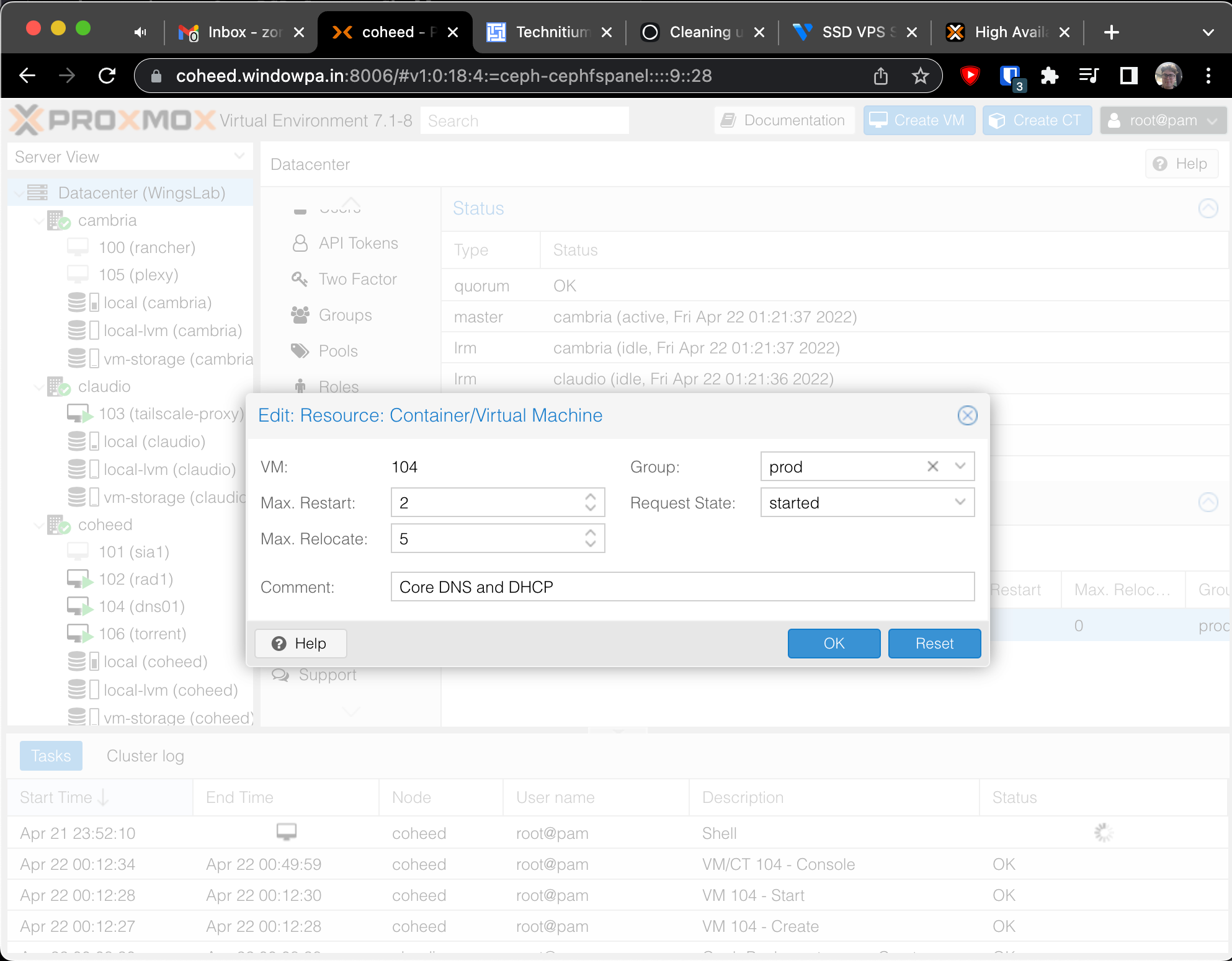 Then created a HA policy for dns01, ensuring it would migrate to the remaining Proxmox hosts if when one fails.