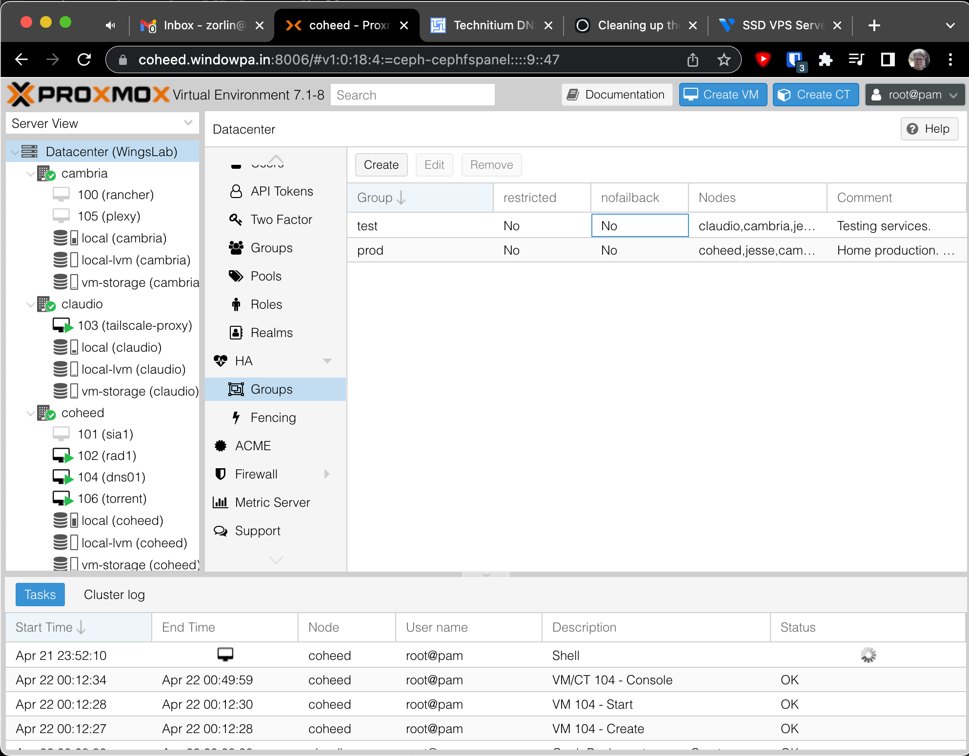 I created HA groups for "test" and "prod" in Proxmox, including all 4 nodes in them...