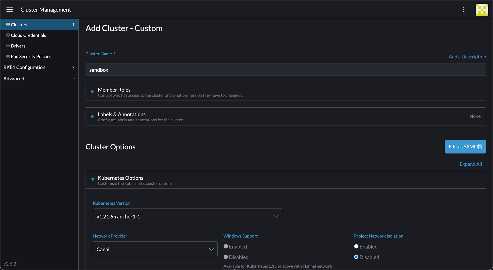 Name the cluster "sandbox", then scroll to the bottom and set the endpoint to k8s.windowpa.in.