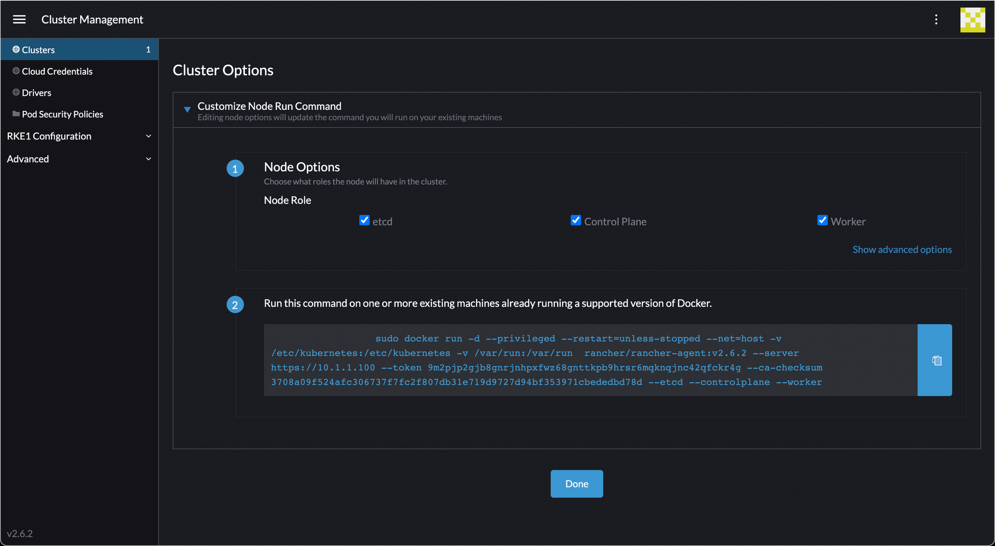 Now that we're all cleaned up, let's create our cluster. In Rancher, go to Cluster Options for the new cluster and check the etcd and Control Plane roles. We'll install all roles on all nodes in this lab.