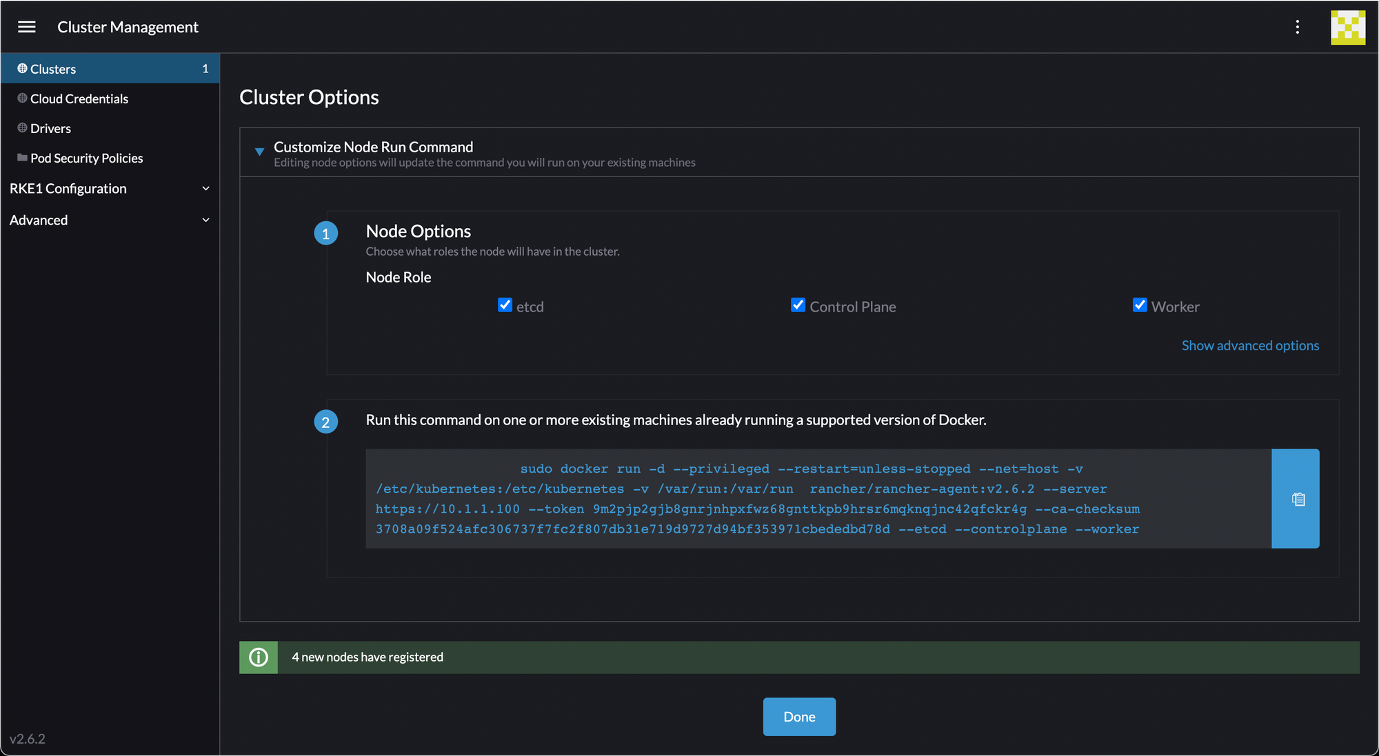 Run the command listed on each node, then notice the helpful green note at the bottom... "4 new nodes have registered".
