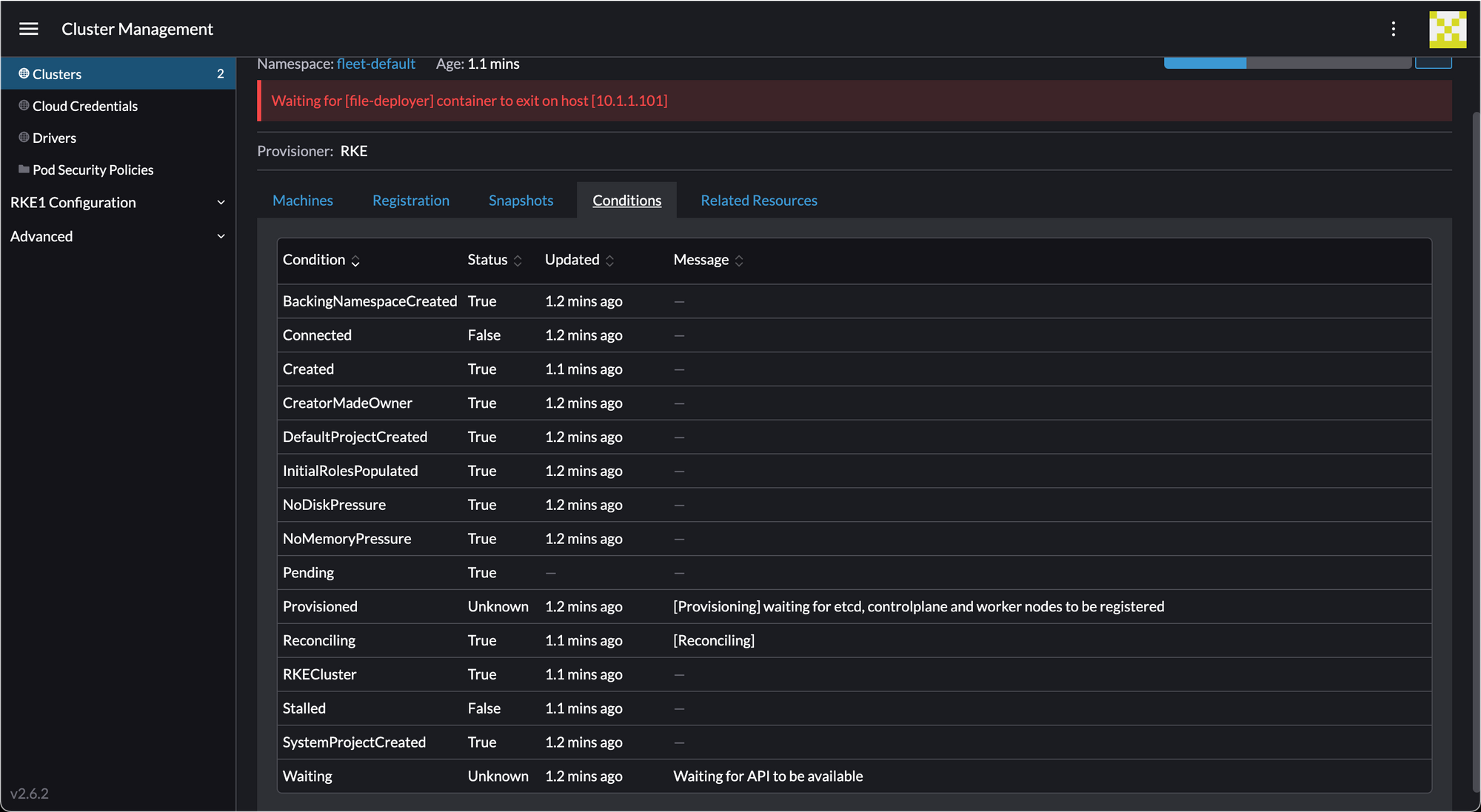 Hit Done and wait a few minutes for the cluster to deploy. You can watch its progress by clicking Conditions.